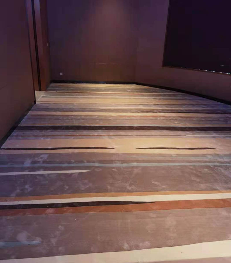 3.地毯、衬垫和胶粘剂等进场后应检查核对数量、品种、规格、颜色、图案等是否符合设计要求,如符合应按其品种、规格分别存放在干燥的仓库或房间内。用前要预铺、配花、编号,待铺设计按号取用。